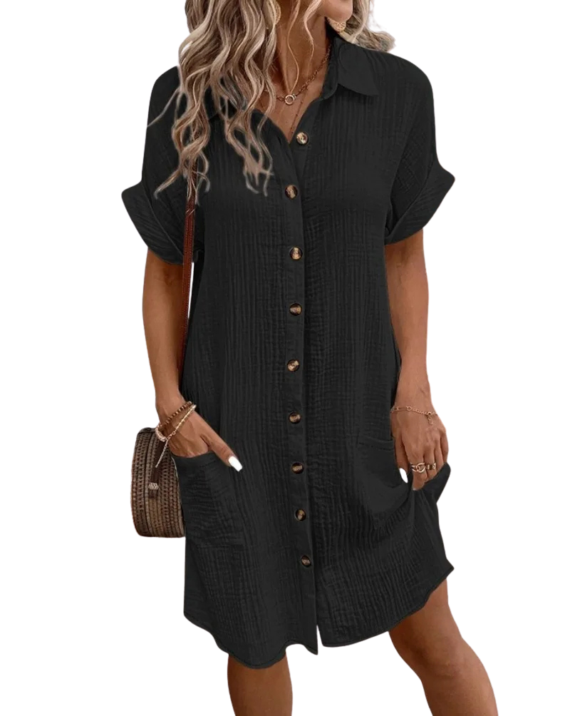 Assolutamente sì! L’abito è realizzato con un tessuto leggero e traspirante, pensato proprio per offrirti il massimo comfort anche nelle giornate più afose, senza rinunciare allo stile.